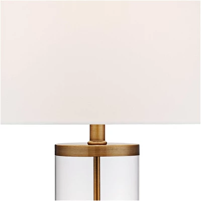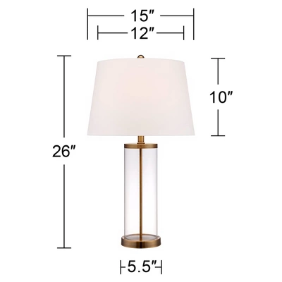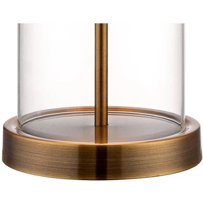The simple design of this clear glass cylinder table lamp set is accented with top and bottom metal trim in shimmering, warm gold finish. The lamp bases open allowing you to fill the glass base with any decorative object of your choosing, such as crystal marbles, shells, or even colored sand.