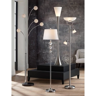 Cool style torchiere lamps help accent your home. This contemporary torchiere floor lamp features a 3-in-1â„¢ design that offers great versatility. Get overall room light from the torchiere and direct task light from the two side lamps.