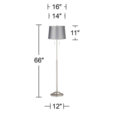 Update your living space with the help of this brushed nickel finish floor lamp. The design is crafted from metal, and has a chic contemporary look that’s paired with a beautiful light gray satin drum shade. It comes with twin pull chains that rev up the style factor and make it easy to control the light output.