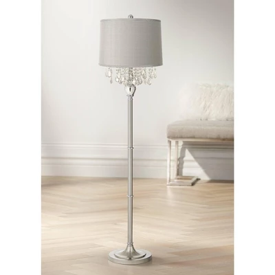 Add eye-catching appeal to your favorite room with our elegant crystal floor lamp. The design features short and long strings of crystal for dramatic sparkle while a chrome finish font on the column adds a jewelry-like touch. A beautiful platinum gray dupioni silk designer shade completes the look.