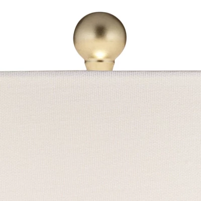 From the 360 Lighting brand, these sleek table lamps combine Mid-Century modern style with modern-day convenience. Each has a decanter-shaped profile ceramic lamp base in white. Gold finish metal accents at the neck and base provide a touch of glamour. The lamps have twin built-in USB ports in their bases, giving you an easy way to keep your phones and other electronic devices charged up and close at hand.